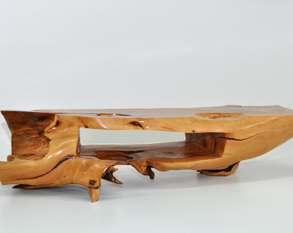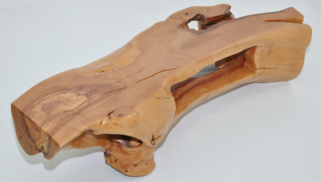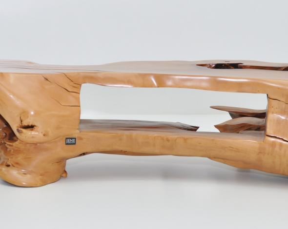 Bei der Herstellung dieses Einzelstücks wurde Apfelbaumholz verwendet. Elegance 1 kann als Couchtisch, Bank oder als TV-Bank dienen. In den Stamm wurde ein Regal eingeschnitten, das als Ablage für Zeitschriften oder unterschiedliche TV-Digitalanlagen verwendet werden kann.