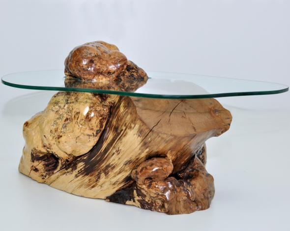 Der unikate Couchtisch Splendour wurde aus einer Holzbildung auf dem Baumstamm einer Buche hergestellt. Die Tischplatte wurde aus gehärtetem Glas erarbeitet. Der Oberteil, der über die Glasfläche reicht, verleiht dem Tisch einen originalen Charakter.