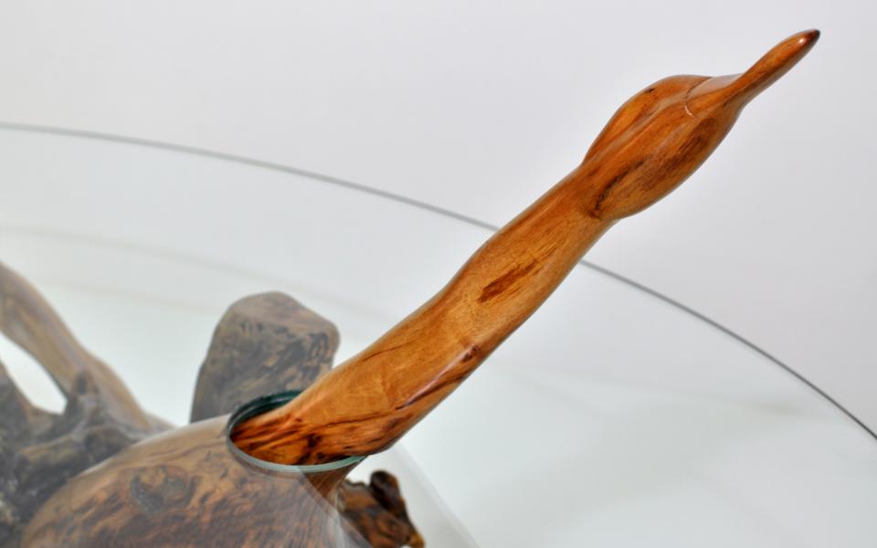 Unikatna klubska mizica Labod je izdelana iz kostanjeve korenine. Za mizno ploščo smo uporabili kaljeno steklo. Posebnost mizice je, da predstavlja laboda. Njegova glava se razprostira nad steklom in tako še bolj izžareva veličastnost in elegantnost klubske mizice.